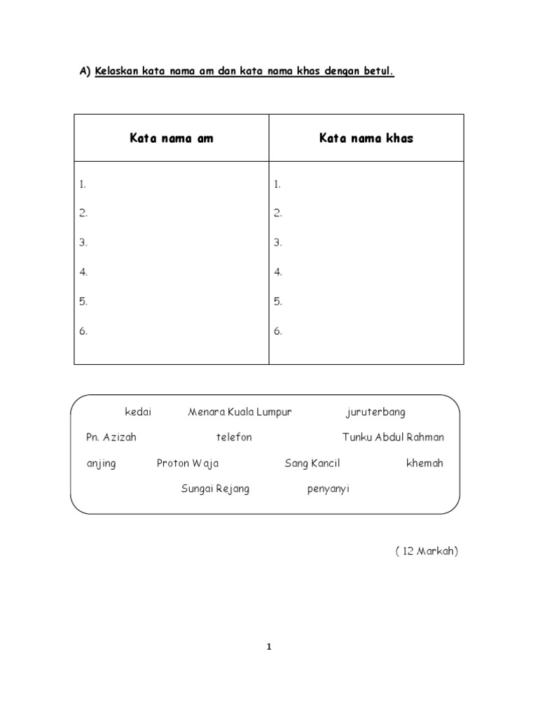 Latihan tatabahasa 2 via www.scribd.com. Kata nama khas merujuk kepada benda, manusia, tempay dan haiwan secara khusus. Mari dapatkan latihan bahasa melayu tahun 3 yang menarik via. Bahasa melayu tahun 6 minda dan emosi yang sihat. Kata nama khas online worksheet for tahun 2. Nama bayi 2 kata islam juga bisa dijadikan nama kepanjangan yang indah dan pastinya menarik. Tahun kemarin memang banyak rintangan yang menghadang. Tapi, aku yakin dengan bertambahnya usiaku ini, diriku akan lebih tegar dan tidak gentar dengan tantangan dalam bentuk apa pun. Kata nama khas digunakan untuk menyebut sesuatu seperti manusia haiwan benda tumbuh tumbuhan dan tempat secara khusus. Berikut ini kami sajikan rangkaian nama anak 2 kata islami untuk bayi perempuan dan laki laki. Merujuk buku teks tahun 4, kata nama khas diulang dalam silibus buku teks bahasa melayu tahun 4, halaman 12. Ayah membawa adik ke perpustakaan raja tun uda untuk meminjam buku cerita. Tandakan kata nama khas yang terdapat pada ayat di atas.